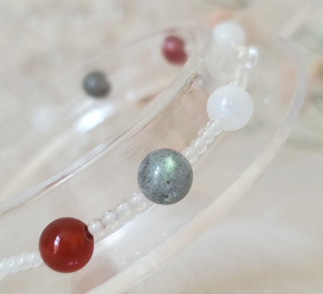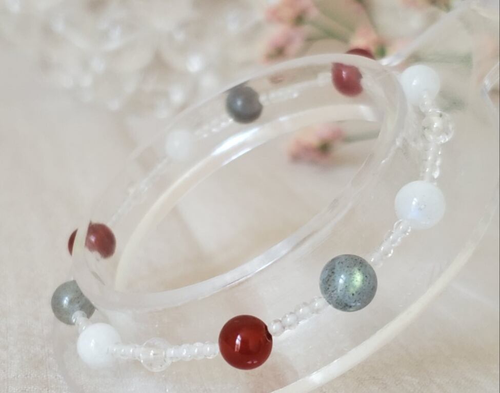 願いを叶えるパワーがあるムーンストーン、宇宙の叡知を呼び込むラブラドナイト、愛の石ローズクォーツ、万能のパワー水晶を組み合わせ、波動が高い虹色に輝くおしゃれで美しいブレスレットを制作しました。