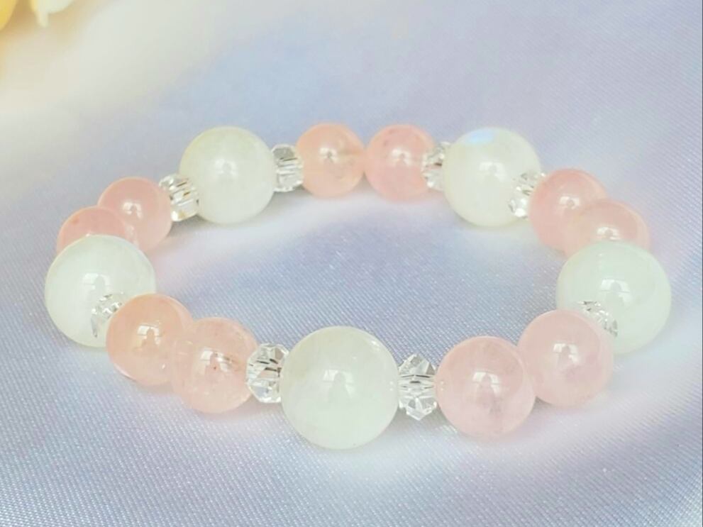 願いを叶えるパワーがあるムーンストーンと魂の出会いを引き寄せるモルガナイトを組み合わせ、波動が高く、上品で愛らしいおしゃれなブレスレットにしました。